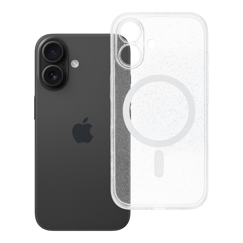 Kryt pro iPhone 16, průhledný model Mag Cover (ochrana objektivu fotoaparátu), kompatibilní s technologií MagSafe, s třpytkami.