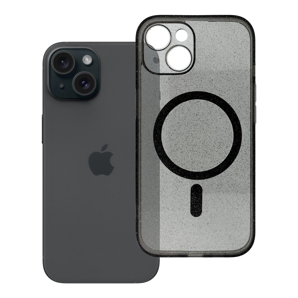 Kryt pro iPhone 15, průhledný model Mag Cover (ochrana objektivu fotoaparátu), kompatibilní s technologií MagSafe, černá barva s efektem třpytek.