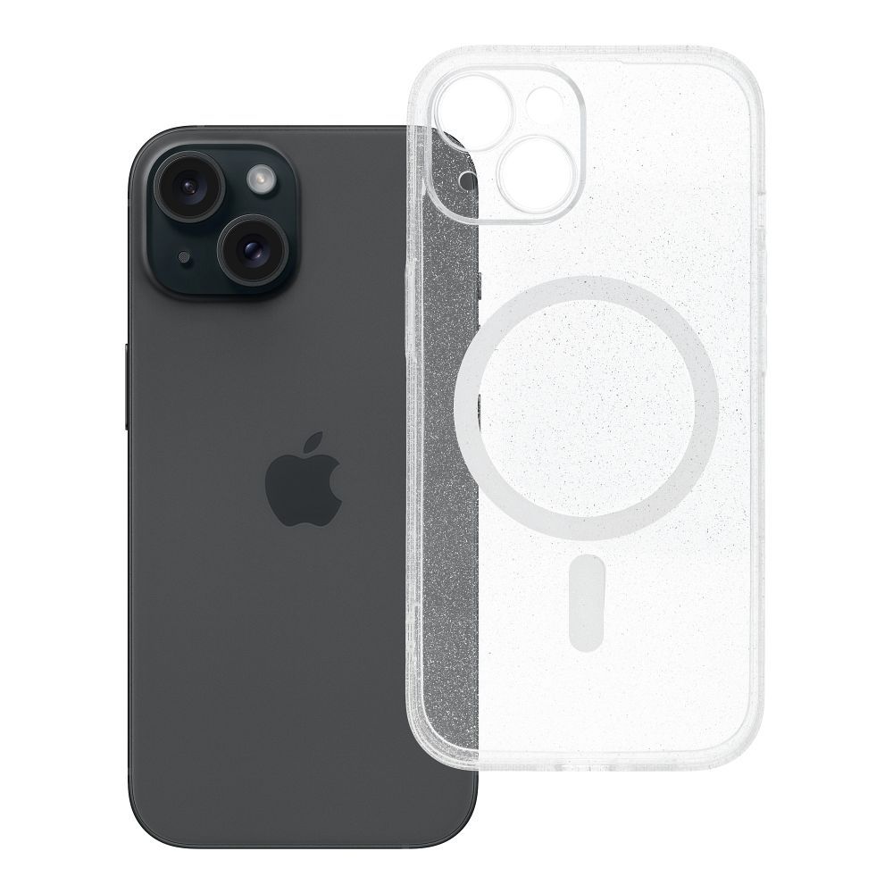 Kryt pro iPhone 15, průhledný, s magnetickým připojením (MagSafe) a ochranou fotoaparátu, s efektem třpytek.
