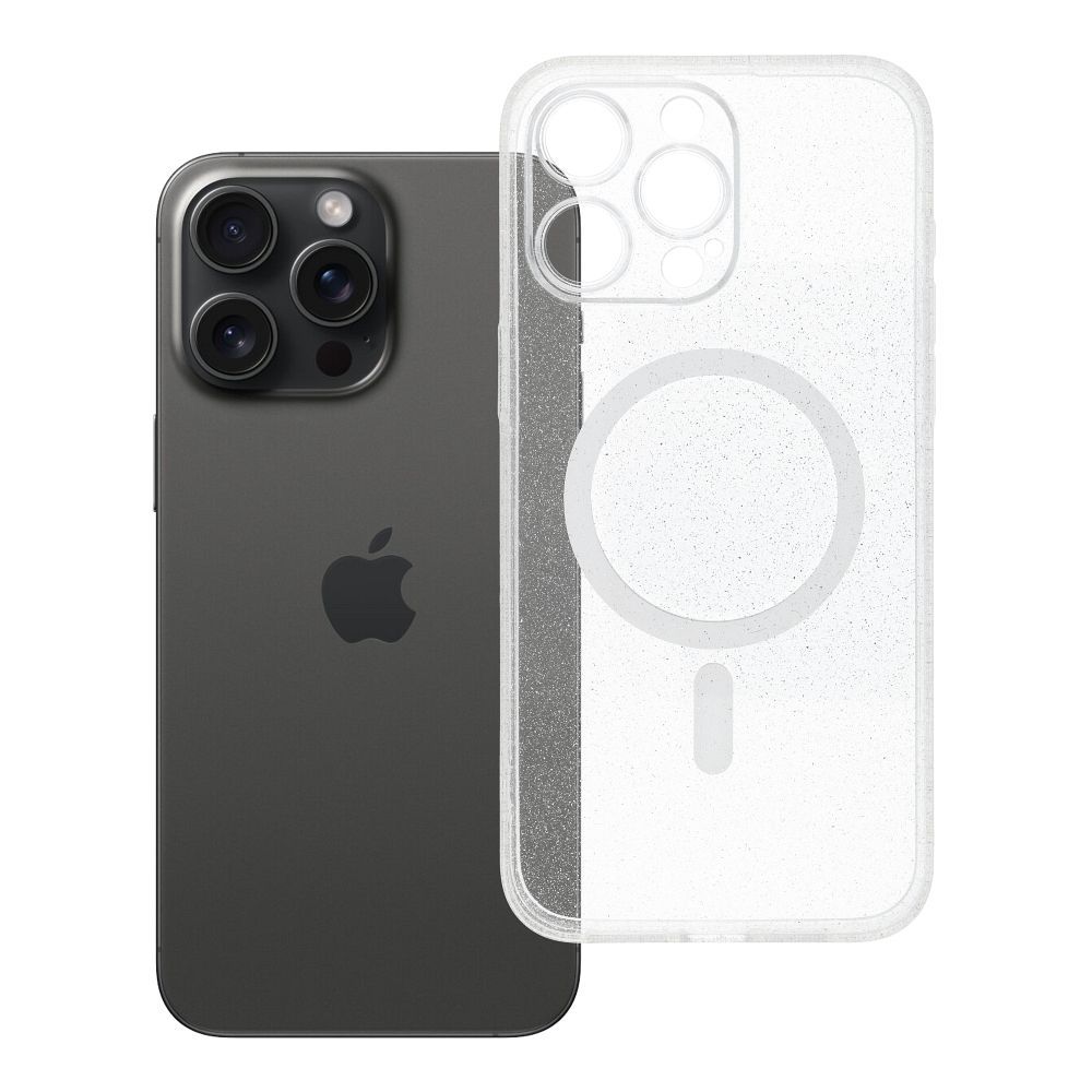 Pouzdro pro iPhone 15 PRO MAX, průhledné, s magnetickou funkcí (kompatibilní s MagSafe), s efektem třpytek a ochranou objektivu fotoaparátu.