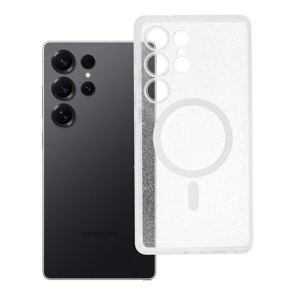 Kryt pro telefon Samsung S25 ULTRA, průhledný, s magnetickým připojením (MagSafe) a efektem třpytek.
