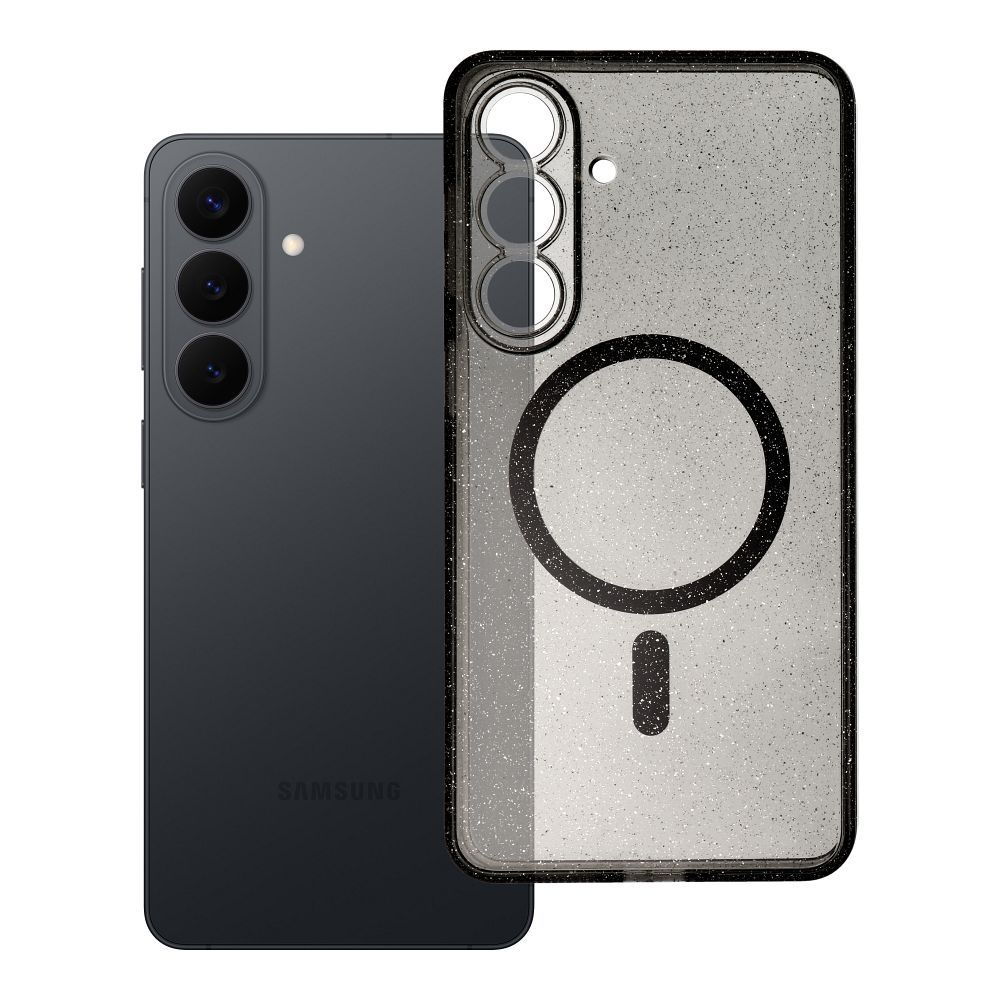 Kryt pro telefon Samsung S26 PLUS, průhledný, s magnetickým zapínáním (STR / OCHRANA KAMERY), kompatibilní s technologií MagSafe, černý s efektem třpytek.