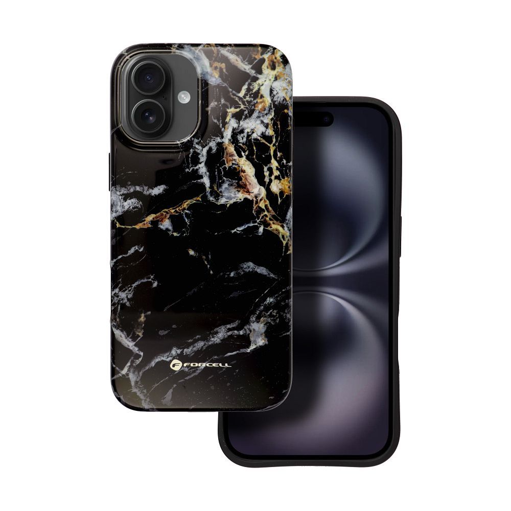 Pouzdro pro iPhone 16 PLUS Forcell F-Protect Mirage, kompatibilní s technologií Magsafe, odolné proti nárazům (testováno podle vojenských standardů), černý mramorový design.