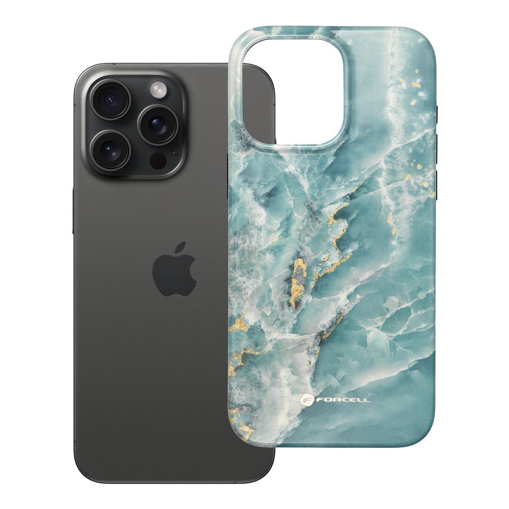 Kryt pro iPhone 15 PRO MAX značky Forcell, řada F-Protect Mirage, kompatibilní s technologií Magsafe, test odolnosti proti pádům (vojenská norma), barva: zelený mramor.