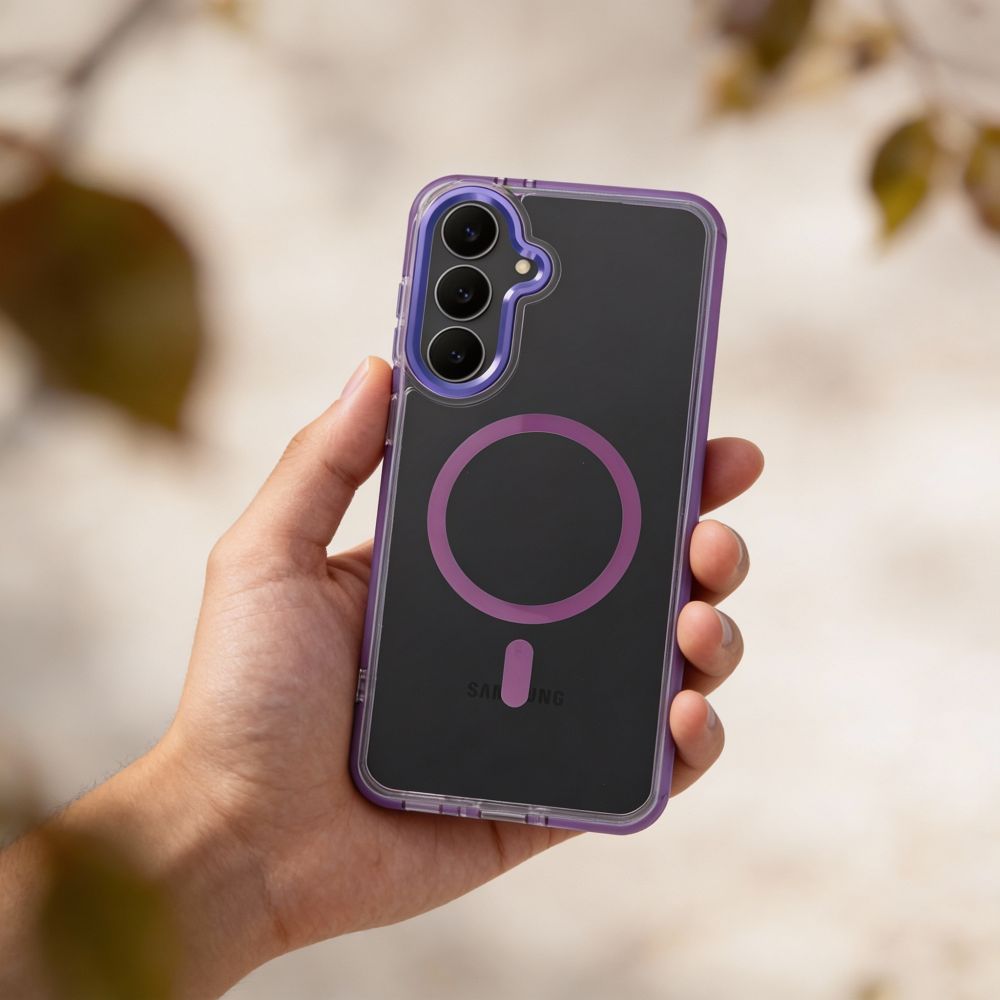 Kryt pro telefon Samsung A17, průhledný hybridní kryt s magnetickou funkcí, kompatibilní s MagSafe, barva fialová.